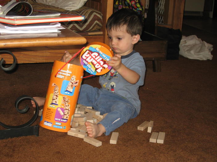 Exploring Jenga at the Silvers' cabin in Lake Tahoe