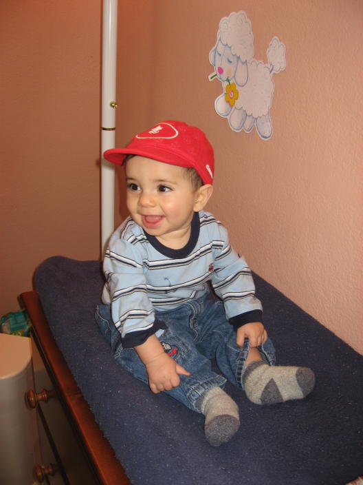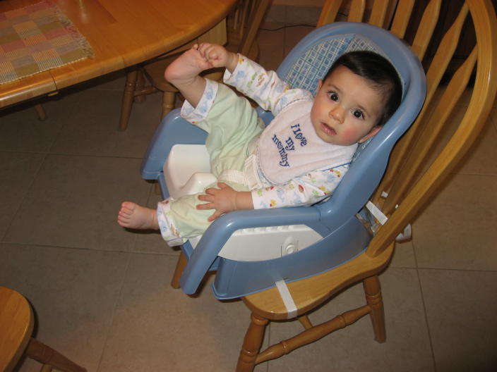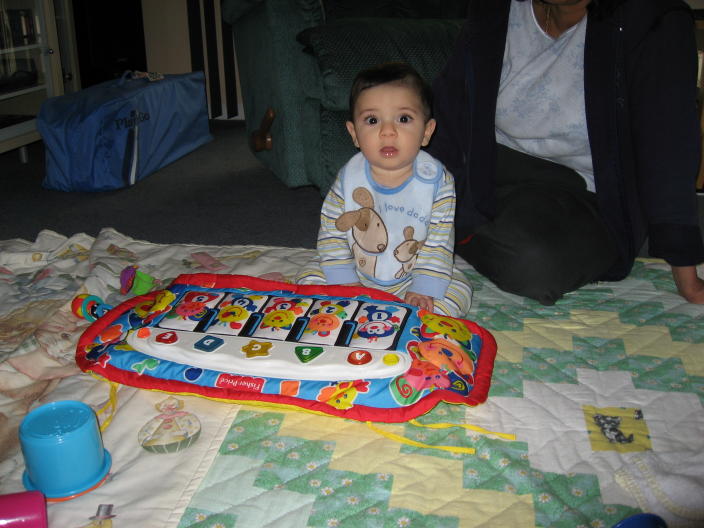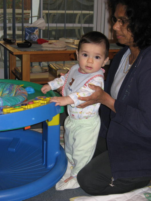 Learning to stand with the help of the exersaucer (and Philomina)