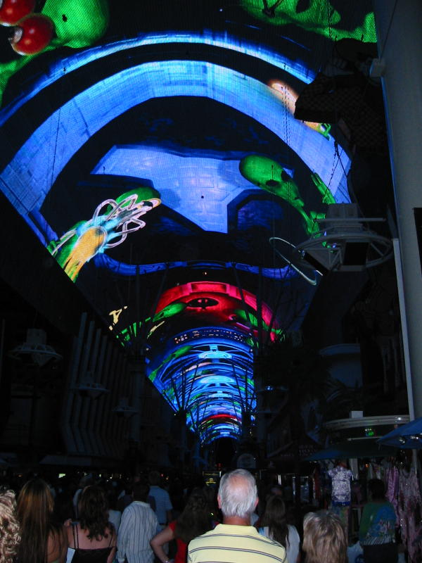 Fremont St was the main strip of old Vegas. Recently they've put a roof over the main part of it, and they have a multimedia show projected on the ceiling.