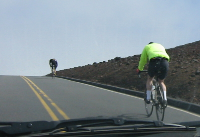 Apart from gradually getting more tired, I really did feel pretty good until we reached the 'false summit' where there is a parking area and some restrooms. The true summit is probably less than half a mile beyond that, but I think that last section of road must be a little steeper, because as I rode that last bit I really started to feel the exhaustion after six hours on the road. My head's down now, just waiting for the end, and the road does actually look pretty steep there.